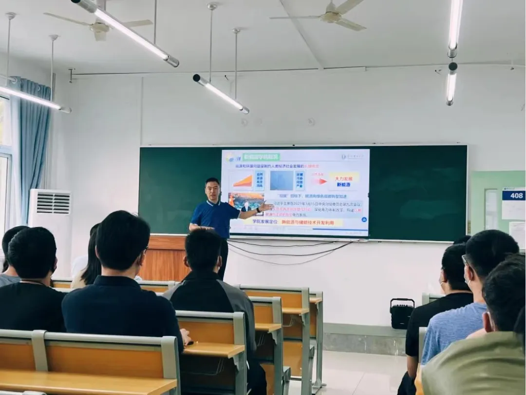 会上,李美成院长对新生的到来表示热烈的欢迎,他从科研平台、教师队伍、学术氛围等多方面对樱花动漫 的建设与发展历程进行详细的介绍,增进了同学们对学院的了解,并结合自身科研经历建议同学们“先把书读薄,再把书读厚”,珍惜青春年华,脚踏实地,在双碳目标下展现新能源学子良好风貌。