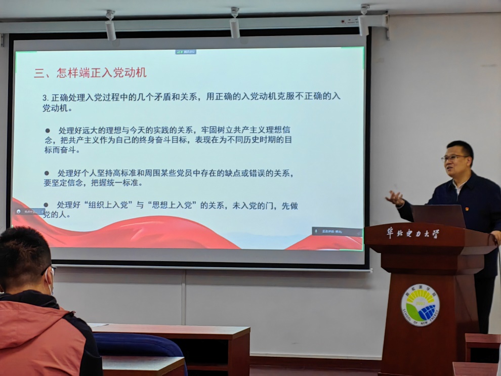 学院党委书记宫凯为培训班学员带来了主题为《坚定理想信念,端正入党动机,以实际行动迎接党的二十大胜利召开》的第一堂党课。他首先阐释了“什么是入党动机”,“什么是正确的入党动机”,其次论述了“为什么要端正入党动机”,接着指明了“怎样端正入党动机”,然后以“习近平总书记的入党之路”为例,阐明正确的入党动机对党员终生保持先进性的重要作用,最后他要求培训班学员切实端正入党动机,用党员标准严格要求自己,做到“四个统一”,后续要认真学习贯彻党的二十大精神,以实际行动争取早日加入党组织。