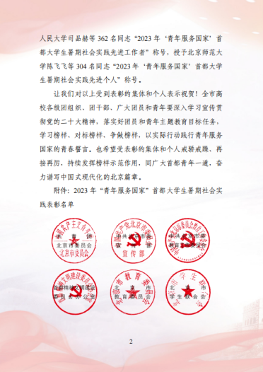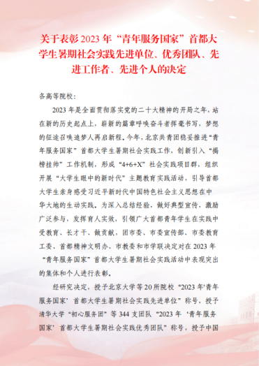 在2023年“青年服务国家”首都大学生暑期社会实践表彰中樱花动漫 “耕新拾光实践团”、“青学践行实践队”荣获“优秀团队”荣誉称号;姜良杰、黄凯兰、崔鹏荣获“先进工作者”荣誉称号。