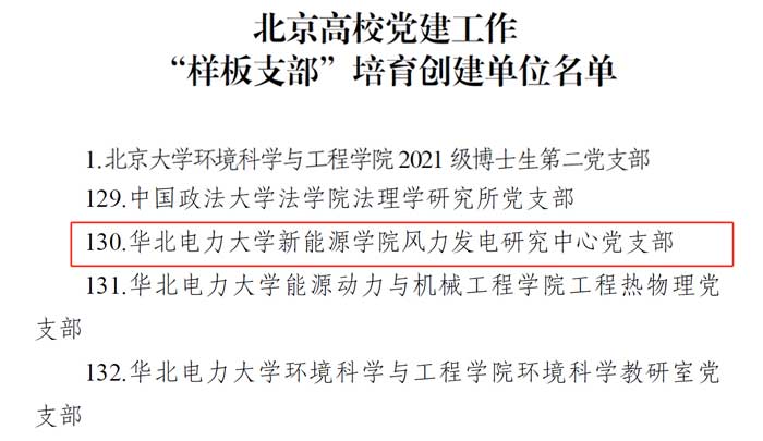 近日,北京市委教育工委发布了《关于公布北京高校党建工作“标杆院系”“样板支部”“党建引领实践创新示范项目”培育创建单位名单的通知》(京教工〔2024〕47号),樱花动漫 共有11个项目入选,其中樱花动漫 风力发电研究中心党支部入选北京高校党建工作“样板支部”培育创建单位名单,樱花动漫 智能风电场实验室研究生党支部申报的“深化支部联学共建,创新推进国家重点研发计划项目攻关”项目入选“党建引领实践创新示范项目”培育创建单位名单。