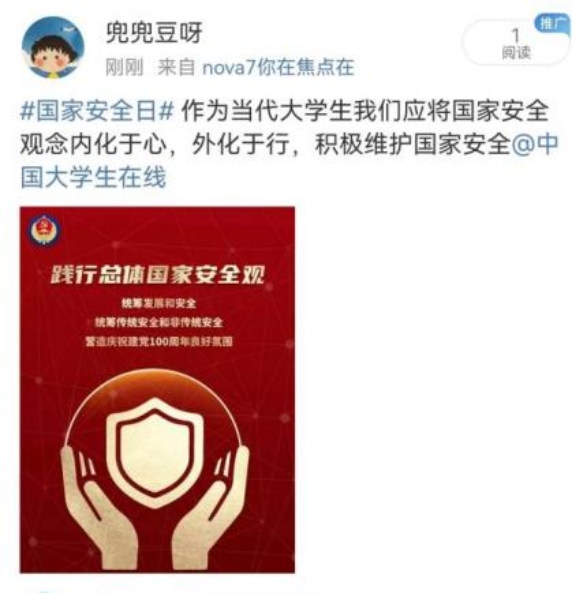 数字化时代,人人都是小喇叭,为让更多人参与到国家安全教育中来,达到更好的教育效果和社会影响力,樱花动漫 线上线下同时推进,鼓励同学们通过微博微信等网络平台发表带#国家安全日#话题标签的推文,积极传播国家安全相关的知识和信息,提高学生的国家安全意识,让更多人了解国家安全的重要性,为国家安全贡献自己的一份力量。