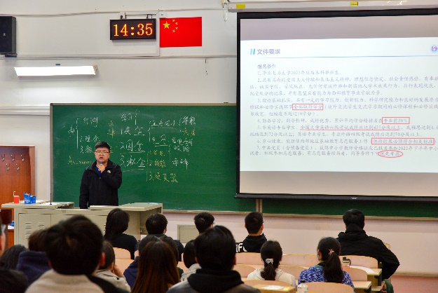 首先,杨子发老师向同学们介绍了学院三个研究生专业,以及近三年学术型硕士、专业型硕士的录取人数与录取分数线等情况,结合当前就业形势,鼓励同学们积极思考、勇敢尝试,结合自身实际情况,明确发展规划,在未来的求学或职业生涯中既要仰望星空,也要脚踏实地。