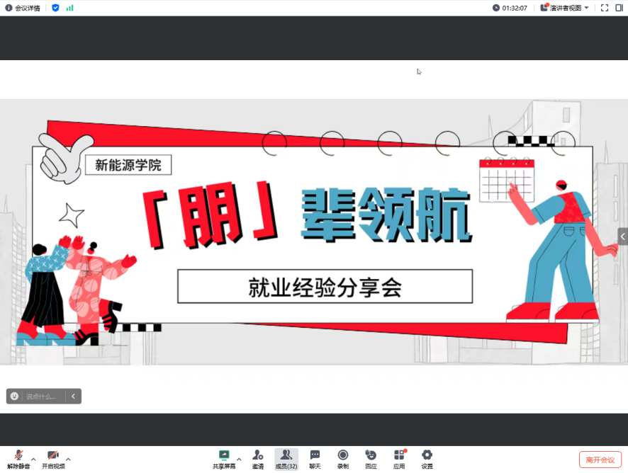 为持续推进学生更充分更高质量就业,发挥朋辈示范引领作用,引导学生了解就业市场需求和提升就业竞争力,更好地规划自己的职业发展道路,新能源学院于12月24日下午在主B606举办“朋辈领航·能源筑梦”就业经验分享会。本次分享会由研究生辅导员陈思主持,活动邀请到6位优秀毕业生代表作主题分享,线上线下60余名研究生参会。