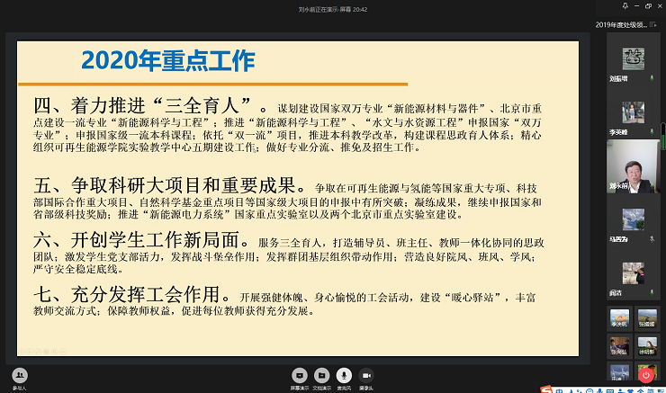 刘书记强调:一是当前正处在疫情防控的关键阶段,各位老师要提高认识,充分关注学院关于疫情防控工作的通知和要求,及时上报相关情况;二是各位授课老师要做好在线教育教学,充分掌握信息化教学手段,保证教学有序进行;三是希望各位老师以处级领导班子和干部考核工作为契机,对于学院领导班子和学院领导各项工作的意见和建议及时提出、充分沟通,促进学院班子更好的为全院教职工服务。