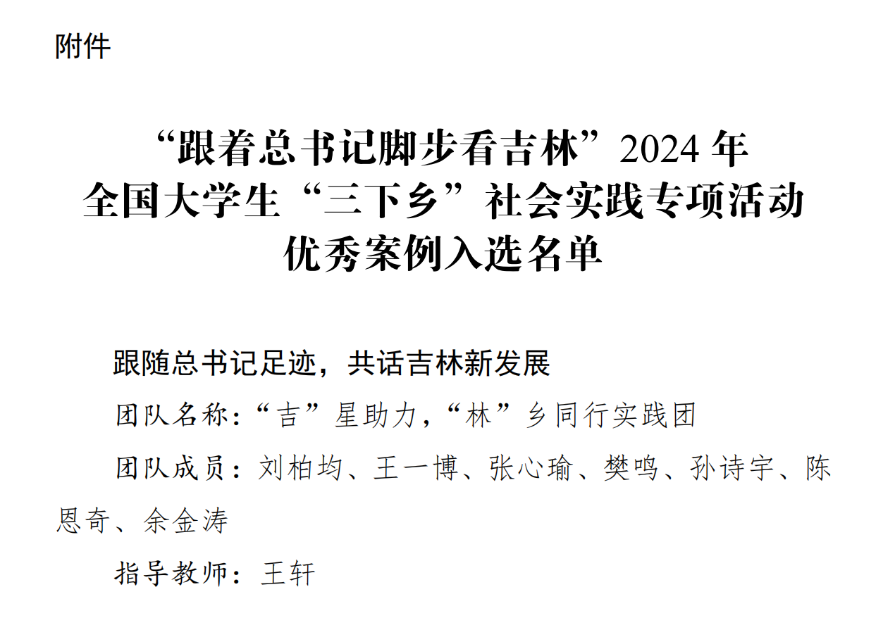 近日,共青团吉林省委、吉林省学联发布《关于入选“跟着总书记脚步看吉林”2024年全国大学生“三下乡”社会实践专项活动优秀案例的通知》。樱花动漫 “吉”星助力 “林”乡同行实践团入选“跟着总书记脚步看吉林”2024年全国大学生“三下乡”社会实践专项活动优秀案例。